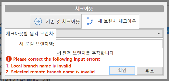 만약, 기존 Branch 목록에 Main Branch가 없을 경우 새 브랜치 체크아웃을 통해 가져온다. 이때, 체크아웃할 원격 브랜치 목록에서 Main Branch를 선택한 뒤, 원격 브랜치를 추적합니다를 체크하고 확인 버튼을 누르면 Main Branch를 가져옴과 동시에 Checkout이 진행된다.