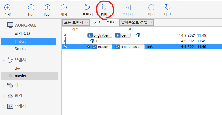 sourcetree UI 상단 아이콘에 있는 병합(Merge) 버튼을 클릭한다.