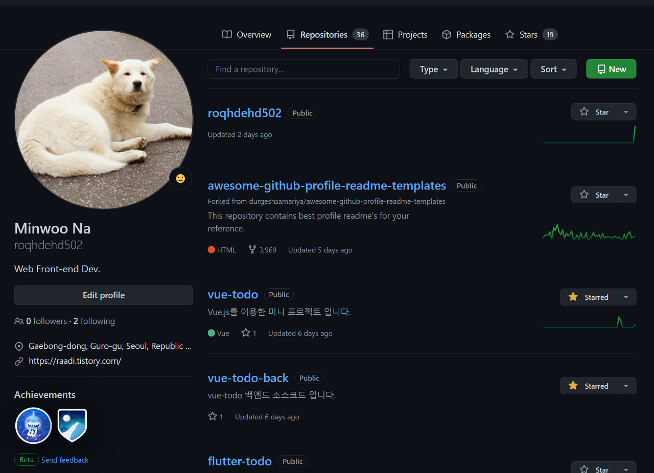 리포지토리에 있는 README.md 파일만 수정하면 본인 프로필 페이지에 정상적으로 반영된다.