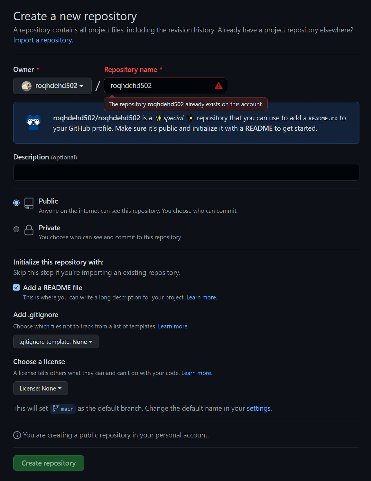 Repository name을 본인 ID로 적은 뒤 Add a README file을 체크 후 Create repository를 눌러 생성한다.