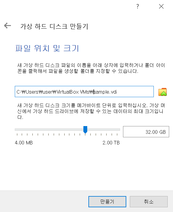 파일 위치 및 가상 디스크 크기를 정하는 선택 화면이 뜨면 파일이 저장될 경로를 지정한다.