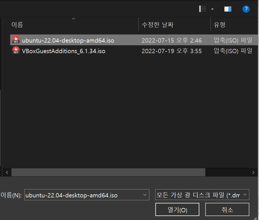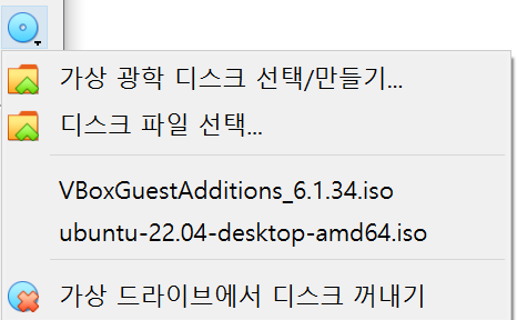 아이콘을 누르면 드롭 다운 메뉴가 뜨는데 디스크 파일 선택 옵션을 클릭 후 Ubuntu를 다운 받은 경로로 들어가 해당 파일을 선택한다.