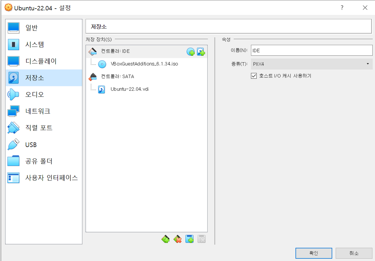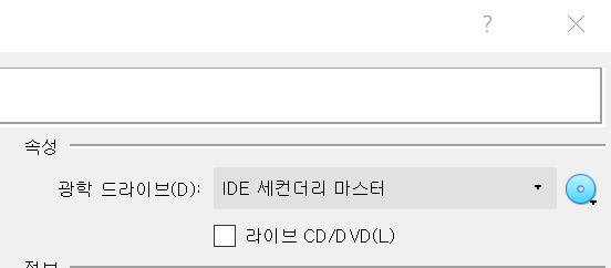 저장 장치 목록에 있는 컨트롤러: IDE를 선택 후 우측의 속성 - 광학 드라이브에 있는 CD 모양의 아이콘을 누른다.