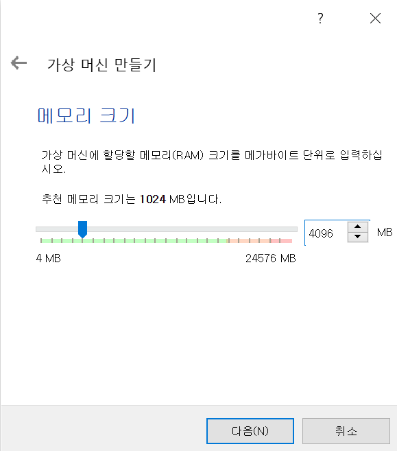 가상 디스크의 메모리 크기(RAM)를 정하는데 우분투OS 권장 조건인 4096 MB로 설정후 다음 버튼을 누른다.