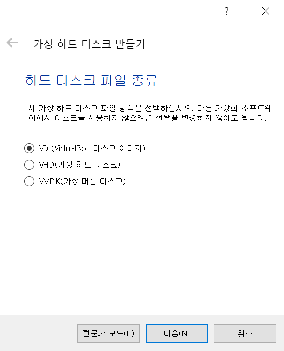 가상 디스크 종류를 선택하는 화면이 되면 VDI(VirtualBox 디스크 이미지)를 선택 후 다음 버튼을 누른다.