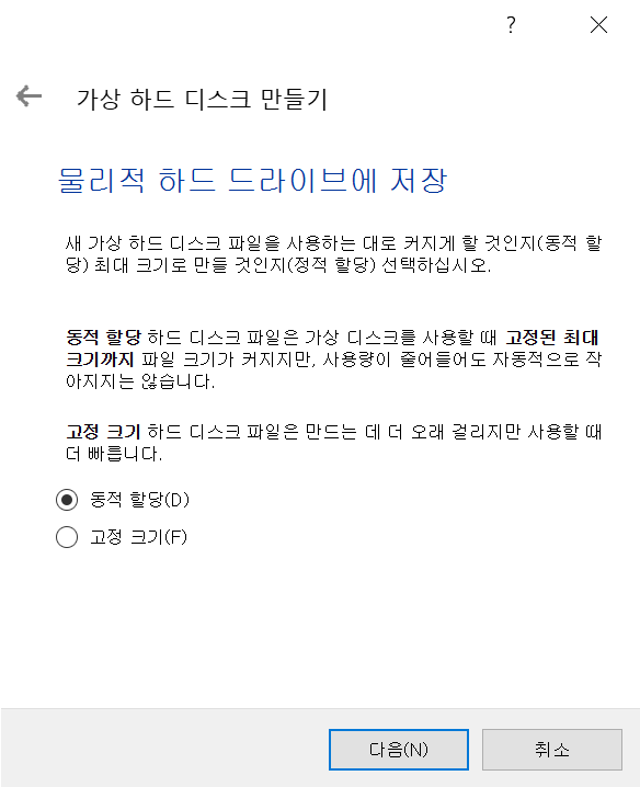 물리적 하드 드라이브 저장 선택 화면이 뜨면 동적 할당을 선택 후 다음 버튼을 클릭한다.