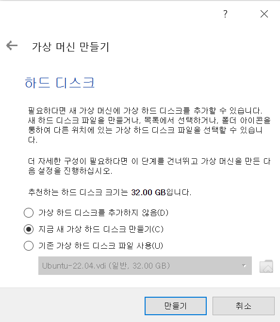 - 새로 만드는 경우 ⇒ 지금 가상 하드 드라이브 만들기