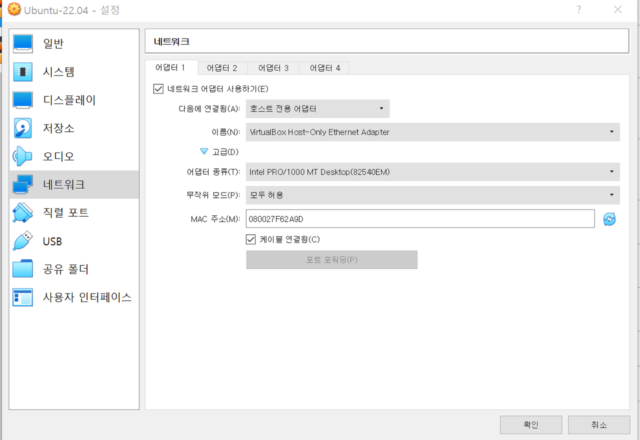 네트워크 탭으로 이동하여 다음과 같은 값으로 설정 후 확인 버튼을 눌러 저장한다.