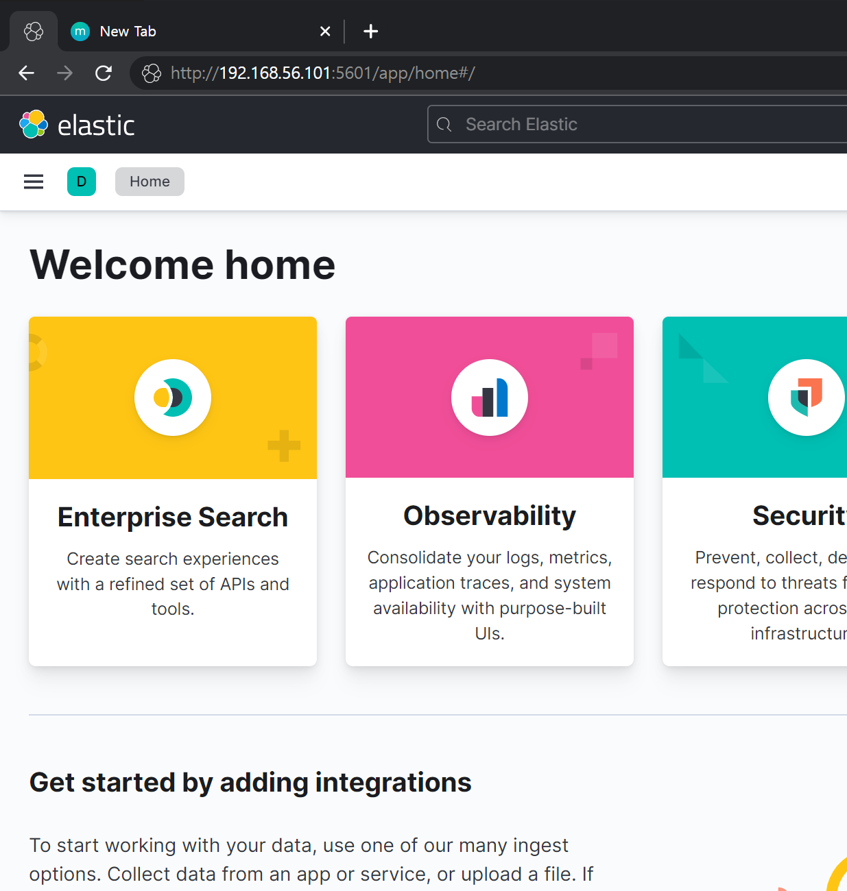 Windows의 웹 브라우저를 킨 후 Ubuntu 서버 주소를 통해 Kibana로 접속한다.