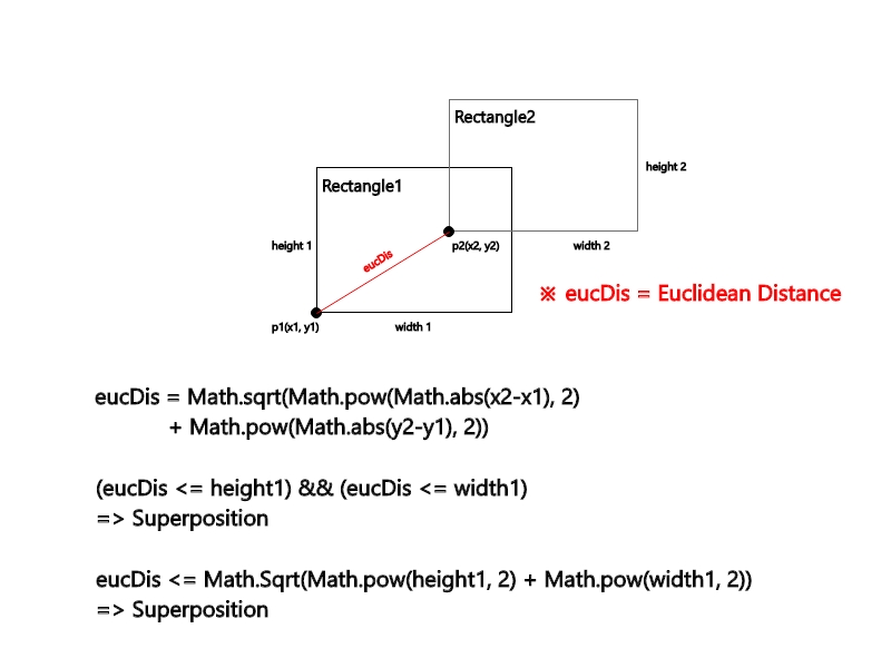 따라서, 점 p1과 점 p2간 유클리드 거리(Euclidean Distance)를 도출하여 이에 대한 판별식을 두고 중첩이 되는지 확인한다.