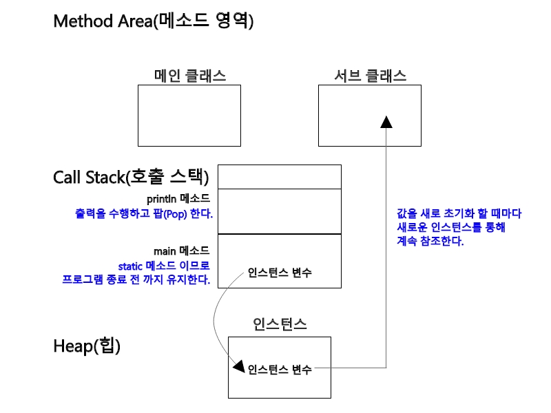 - Heap(힙)인스턴스가 생성되는 공간으로 프로그램 실행 중 생성되는 모든 인스턴스가 이곳에 생성된다.