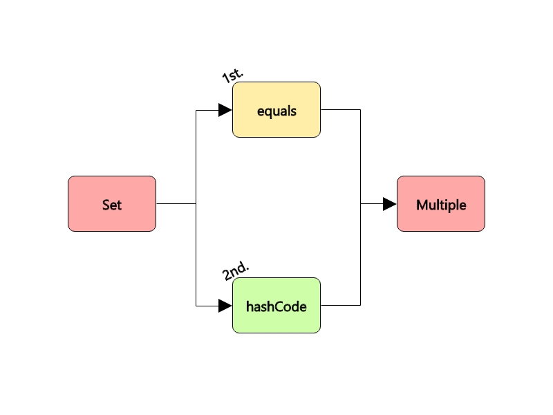위 그림과 같이 equals를 거쳐 hashCode 메소드를 통해 둘 모두 결과가 같을 경우 중복 판정이 되는데