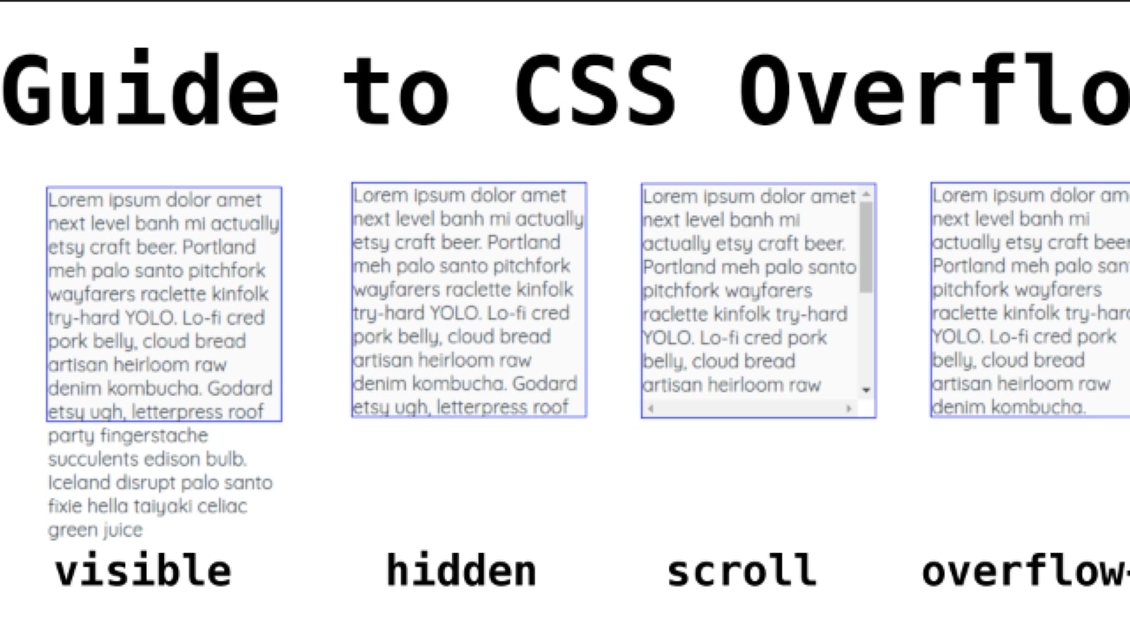 : 웹 페이지를 구현할 때 한 구역에 일정량 이상의 텍스트나 이미지 같은 컨텐츠들을 입력하면 일어나는 현상으로 여기서 오버플로우(Overflow)는 이러한 일이 있을 때 어떻게 보여주는지 결정하는것을 일컫는다.