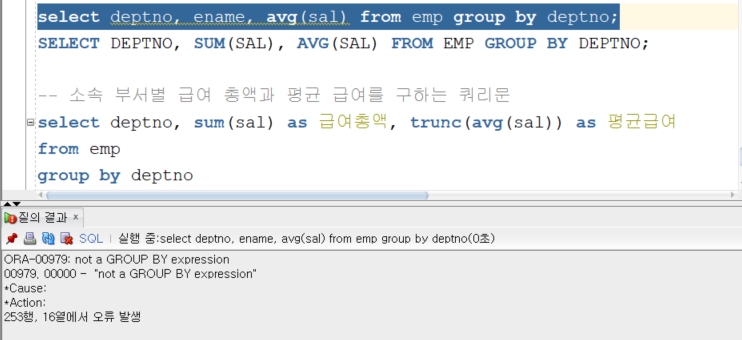 해당 에러(ORA-00979: not a GROUP BY expression)는 여러 컬럼들을 그룹으로 묶어서 조회할 때 발생할 수 있는 에러로 조회하는 컬럼과 그룹을 적용하는 컬럼의 차이로 인해서 해당 기준이 모호하므로 발생한다. 따라서, GROUP BY 문을 사용할 때는 반드시 그룹 함수 외에 조회하는 컬럼 모두를 표시해야 한다.